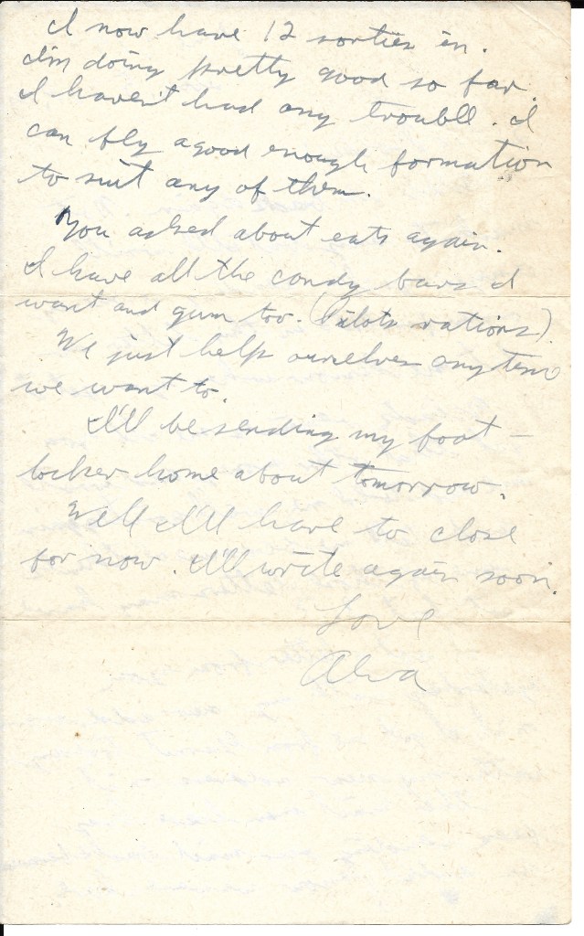 You asked about eats again. I have all the candy bars I want and gum too. (Pilots rations). We just help ourselves anytime we want to.