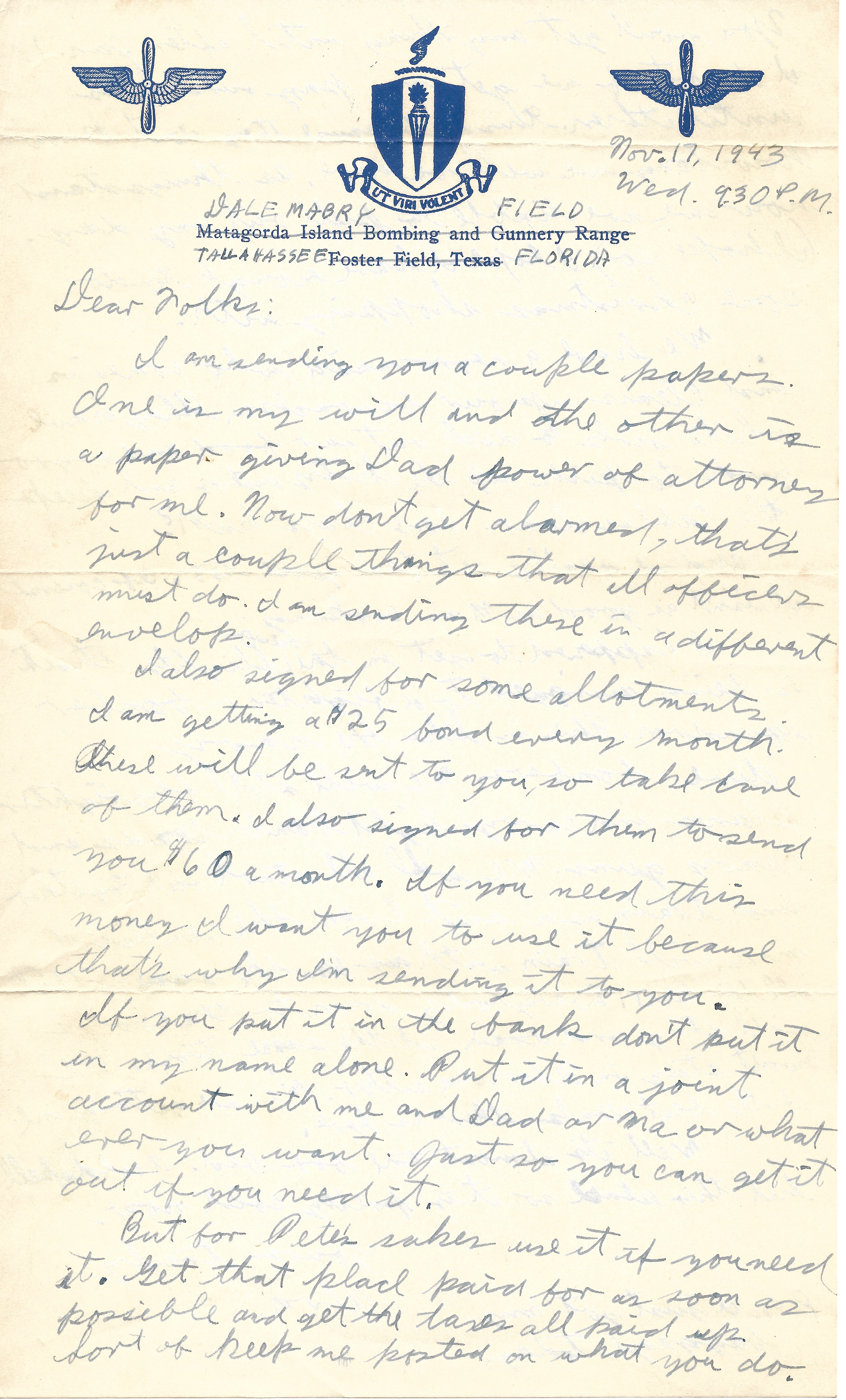 I am sending you a couple papers. One is my will and the other is a paper giving Dad power of attorney for me. Now don’t get alarmed. That’s just a couple things that all officers must do. I’m sending these in a different envelop.