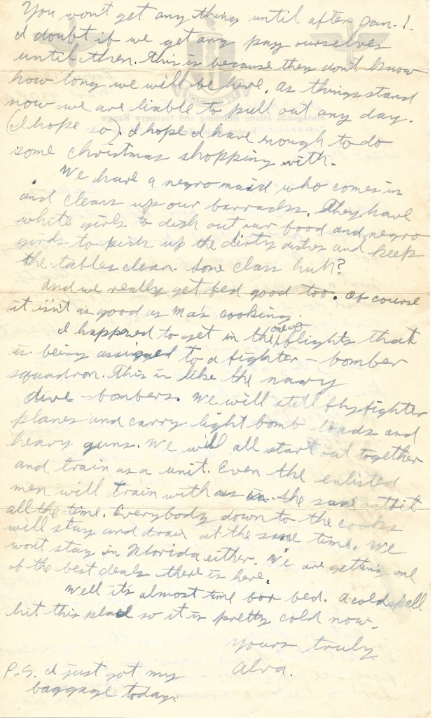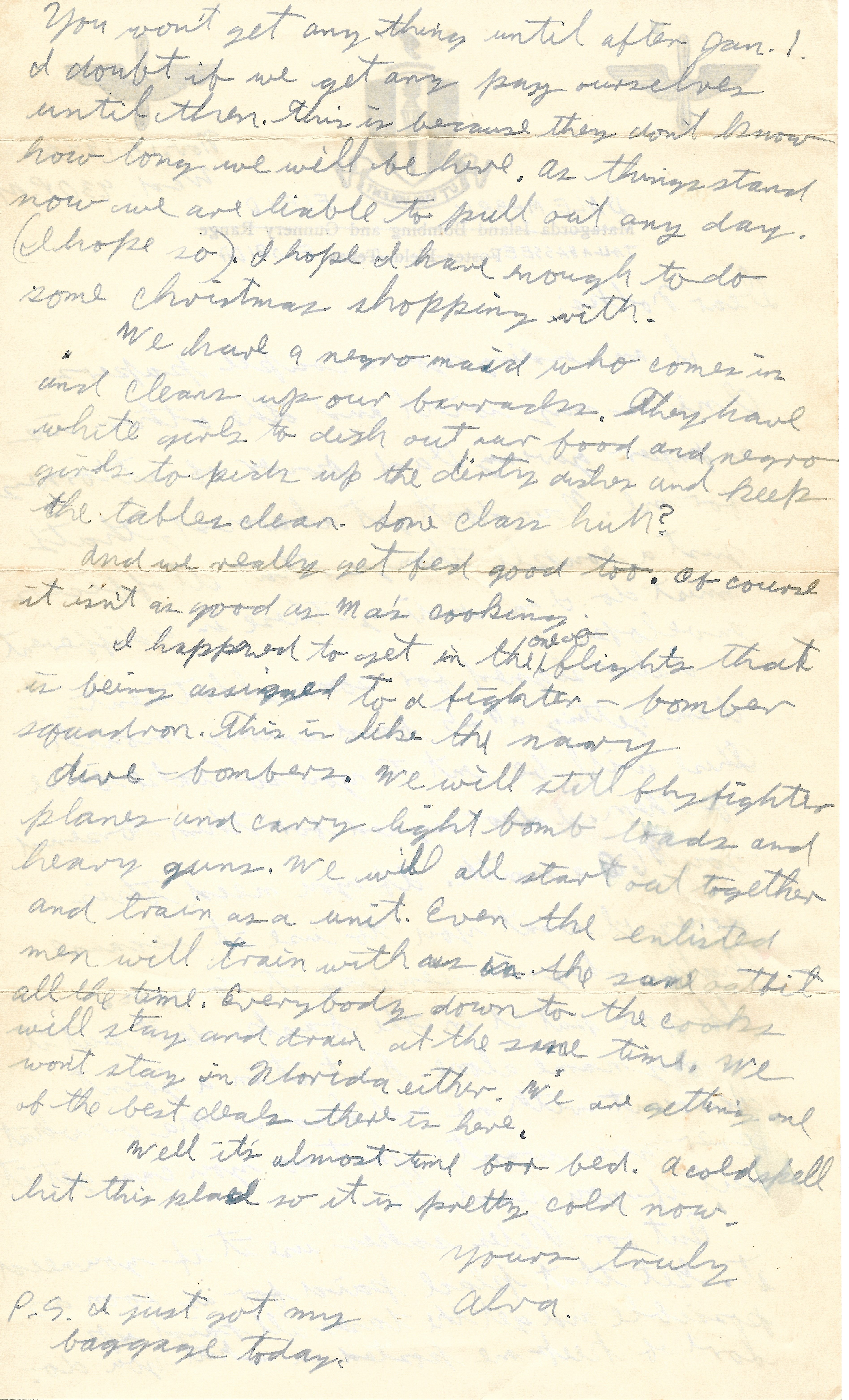 I happened to get in one of the flights that is being assigned to a fighter-bomber squadron. This is like the navy dive bombers. We will still fly fighter planes and carry light bomb loads and heavy guns. We will all start out together and train as a unit. Even the enlisted men will train with us in the same outfit all the time. Everybody down to the cooks will stay and train at the same time. We won’t stay in Florida either. We are getting one of the best deals there is here.