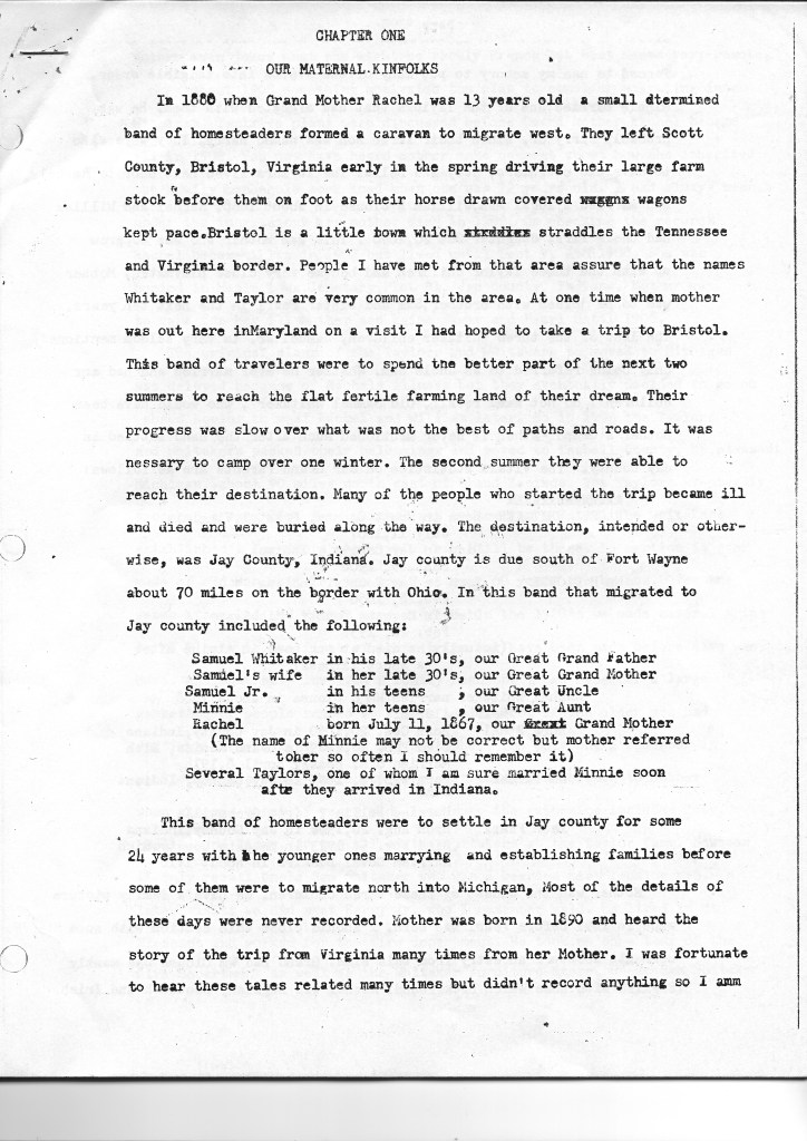 These are corrections to Uncle Murell’s Family History. In Chapter One he states that Rachel Whitaker’s family left Virginia in 1880. I was unaware that it was that early. It must have been right after the 1880 census was taken that listed them in Virginia. Her two oldest brothers, Adison and Franklin, are listed as already living in Indiana in the 1880 census, Franklin having had a child in 1877 in Indiana. So they must have come on ahead of Landay Whitaker (great grandfather) and the rest of the family. I also did not realize it took over two summers to arrive in Indiana. What a journey that must have been!