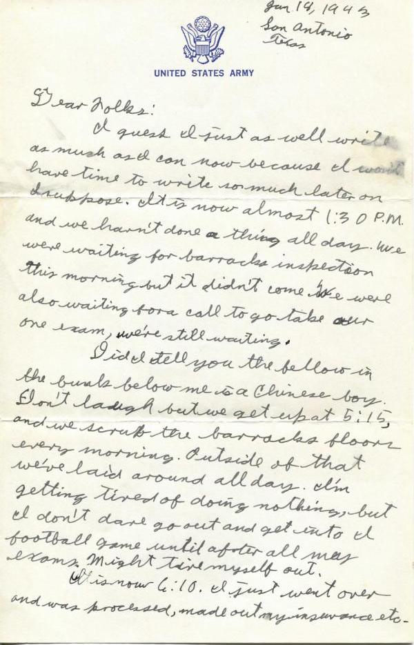 I guess I just as well write as much as I can now because I won’t have time to write so much later on I suppose. It is now almost 1:30 P.M. and we haven’t done a thing all day. We were waiting for barracks inspection this morning but it didn’t come. We were also waiting for a call to go take our one exam, we’re still waiting.