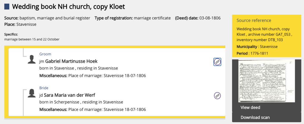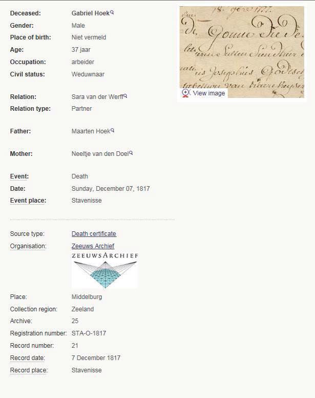 My 4th great grantfather, Gabriel Martinus Hoek, was born in Stavenisse, Tholen, Zeeland, Netherlands on 30 Mar 1781. He married Sara Maria Van der Werff on 3 Aug 1806. Over the next nine years they would have five children, one son only living a short time. Gabriel’s wife Sara died in April of 1817. He died just eight months later at age 37, leaving four children ten years old and under. Only one of their children, daughter Hendrina “Anna” Hoek (married to Martin Kornoelje), eventually came to America.