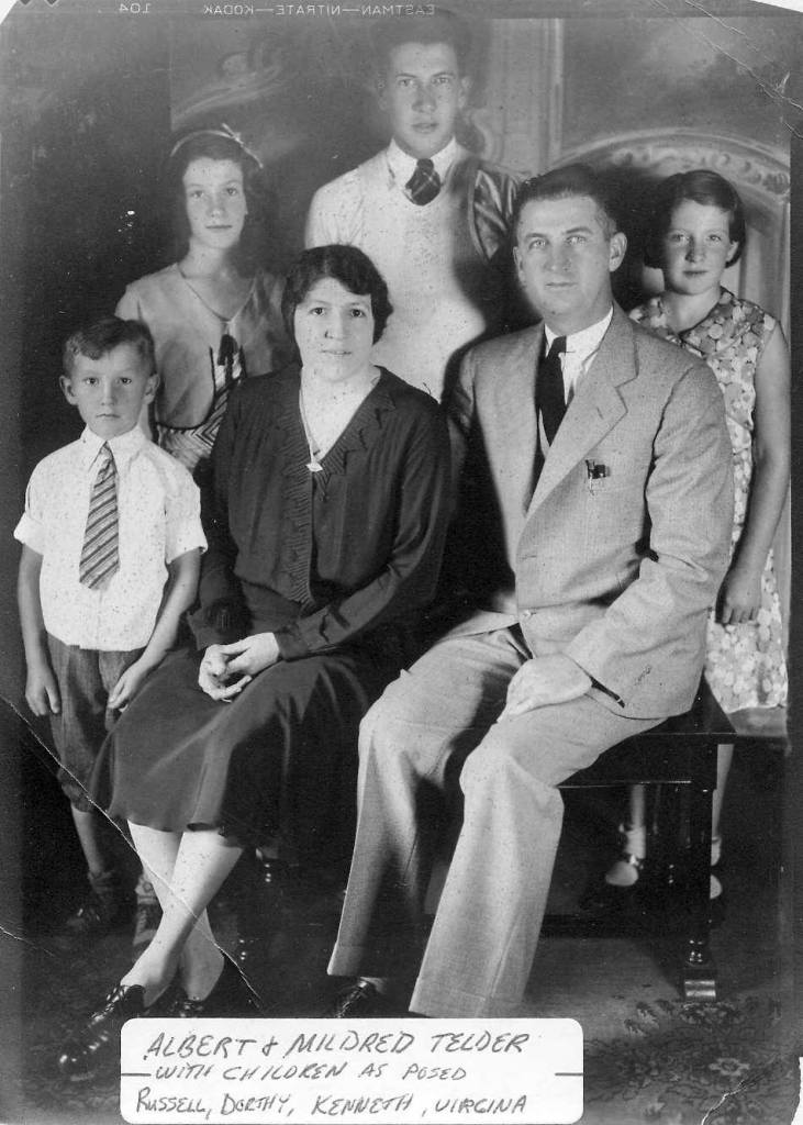 Albert Dean Telder, second son of Martin and Anna Telder, brother of Joanna Telder Holmquist, born 1896 in Grand Rapids, MI and died 1977 in Plant City, FL, with wife Mildred and children Russell, Virginia, Kenneth, and Dorothy. (note names of the two girls are switched on the photo).