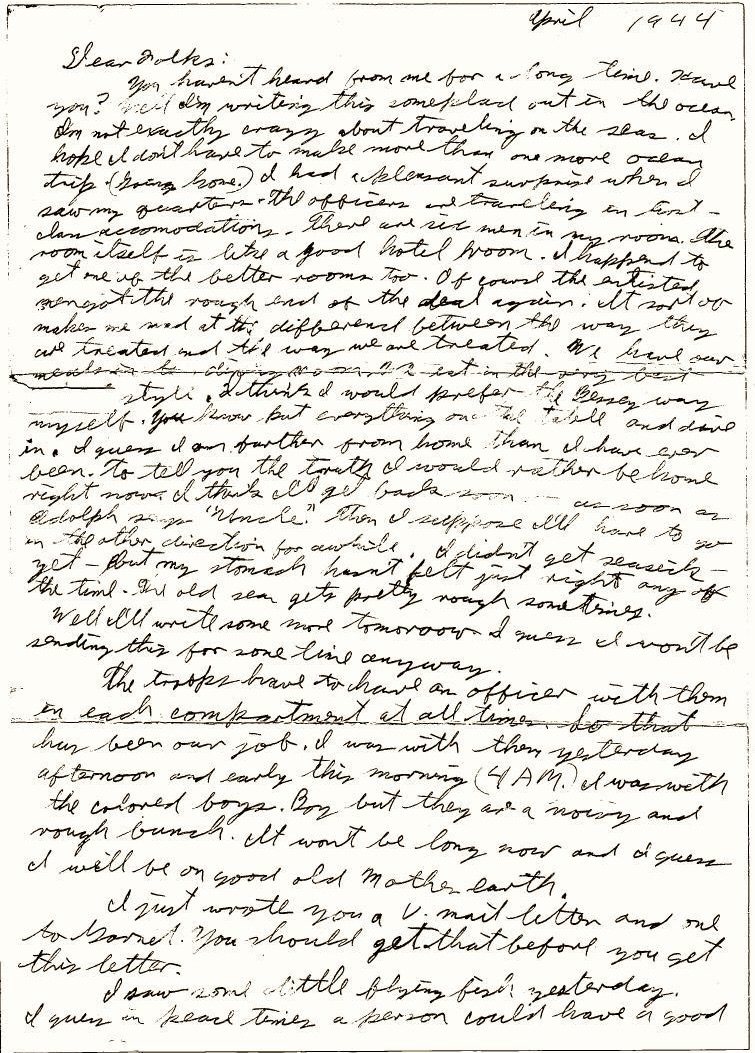 The troops have to have an officer with them in each compartment at all times. So that has been our job. I was with them yesterday afternoon and early this morning (4 AM). I was with the colored boys. Boy but they are a noisy and rough bunch. It won’t be long now and I guess I will be on good old Mother Earth.