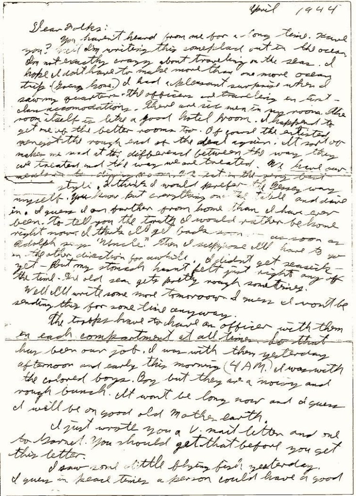 You haven’t heard from me for a long time. Have you? Well I’m writing this someplace out in the ocean. I’m not exactly crazy about traveling on the seas. I hope I don’t have to make more than one more ocean trip (going home).