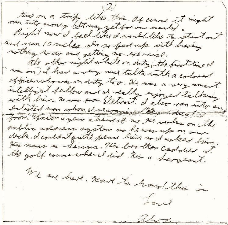 The other night while on duty (the first time I was on), I had a very nice talk with a colored officer who was on duty too. He was a very smart intelligent fellow and I really enjoyed talking with him. He was from Detroit. I also ran into an enlisted man who I recognized. He graduated from Union a year ahead of me. He works on the public address system so he was up on our deck. I couldn’t quite place him so I asked him. His name is Simms. His brother caddied at the golf course when I did. He’s a Sergeant.