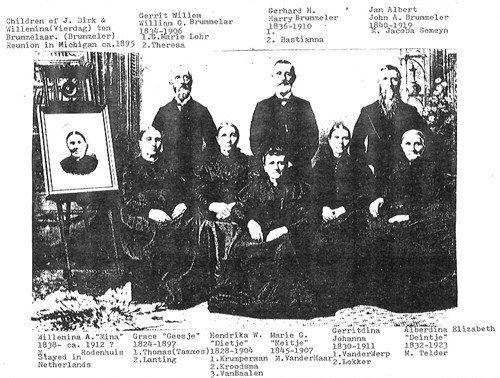 The is a picture of the children of Jan Derk and Willemina Brummeler (first photo courtesy of Ernie Richardson, a descendant of Jan Albert Brummeler). Alberdina Brummeler Telder is in the front on the far right. She was the grandmother of Joanna Telder Holmquist. Sitting next to Alberdina is her sister Gerritdina. Gerritdina’s husband received a calling from a church in Michigan in the 1860s, and it is for this reason the family moved from the Netherlands to Michigan.