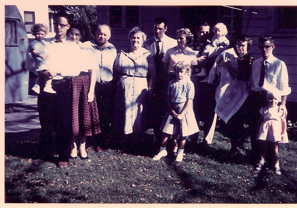 Elmer and Joanna Holmquist group pic 1958 Taken perhaps the summer of 1958. Left to right: Chet holding Karen and Marjorie, Elmer, Joanna, Paul, Dorothy, Judy in front of Dorothy, Erwin holding Connie, Arlene holding Dan, Chuck and Sarah Share this: Print (Opens in new window) Print Like Loading...