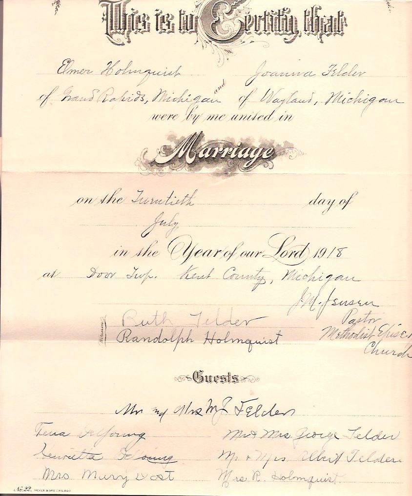 This is to Certify that Elmer Holmquist of Grand Rapids, Michigan, and Joanna Telder of Wayland, Michigan, were by me united in Marriage on the twentieth day of July in the Year of our Lord 1918 at Dorr Twp, Kent County, Michigan.