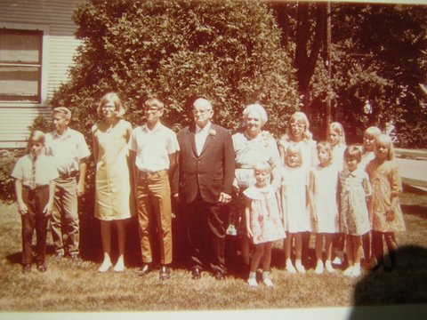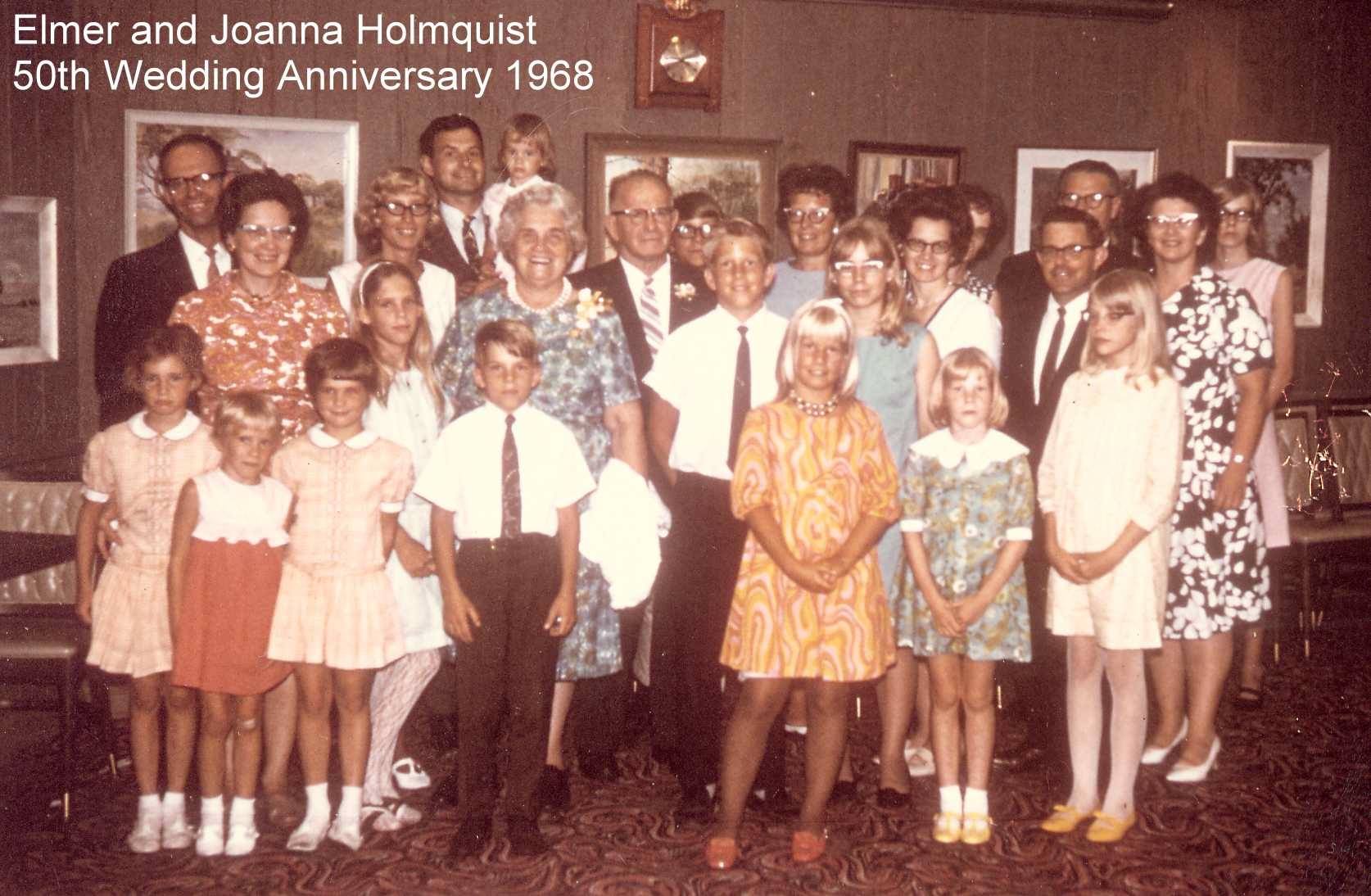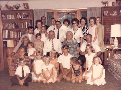 50th wedding anniversary of Elmer and Joanna Telder Holmquist with their grandchildren.Dan Bour, Leon Klint, Judy Holmquist Stilley, Robert Klint, Elmer, Joanna, Sarah Bour Karnes, Karen Scheltema Swan, Connie Holmquist Graham Front: Sharon Holmquist Nauta, Joanna Holmquist VanHolstyn, Rose Scheltema Zellmer, Coral Scheltema Wheeler, Marcie Klint Lockard.