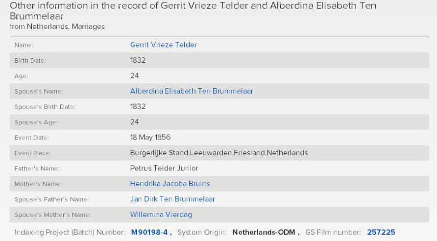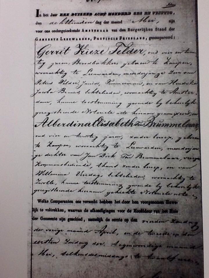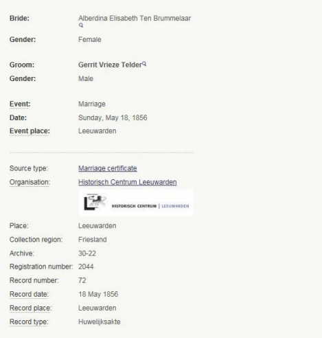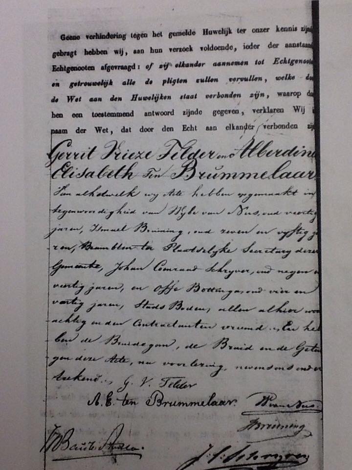 Marriage record of Gerrit Vrieze Telder and Alberdina Elisabeth Brummeler who were married in the Netherlands in 1856. (Paternal grandparents of Joanna Telder Holmquist)