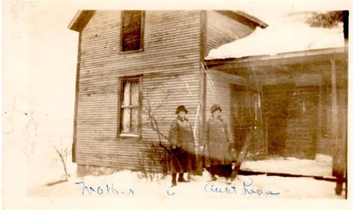 back of photo reads: Home of Ingrid Marie and John Peter Nelson(Nilsson) at Hewitt Lake, Tustin, MI. on eighty acres that included all of the lake. In the photo is Johanna Nilsson/Johnson and sister Lena, daughters of Peter and Ingrid. Johanna became mother to Ingrid Holmquist.