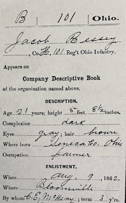 Jacob enlisted on 9 Aug 1862 in Bloomville, Seneca County, Ohio for a term of 3 years. He was listed as being 21 years of age, however he was actually 22 1/2. He was 5 feet 8 1/2 inches tall, had gray eyes, brown hair, and a dark complexion. His occupation was listed as farmer.