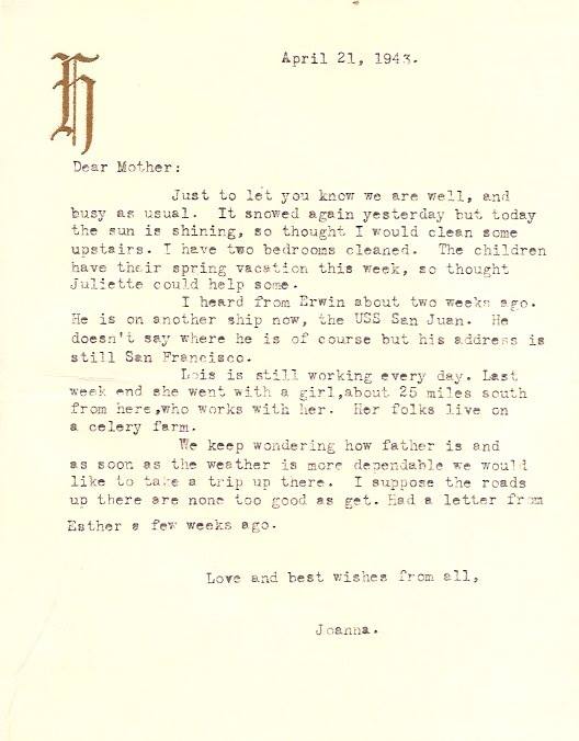 Letter written by my grandmother, Joanna (Telder) Holmquist, to her mother-in-law, Hanna Holmquist, in Tustin, Michigan in 1943. Do you notice she said it snowed on April 20? Wow!Edit