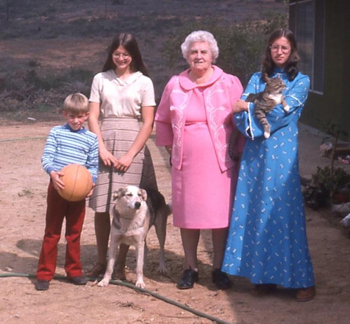 Grandma (Joanna) Holmquist on one of her trips to California along with Chester, Coral and Rose and the dog and cat! Taken mid-70s.