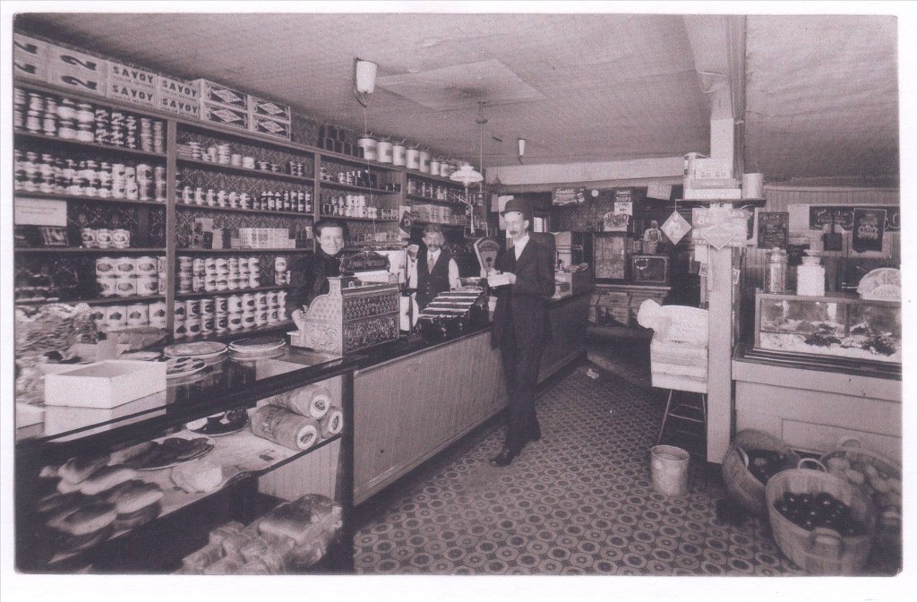 Johannes and Katie Kornoelje had a general store on the SE side of Grand Rapids. In this picture (courtesy Sue Davis) behind the counter are Johannes and Katie Kornoelje. The man in front is their son John.