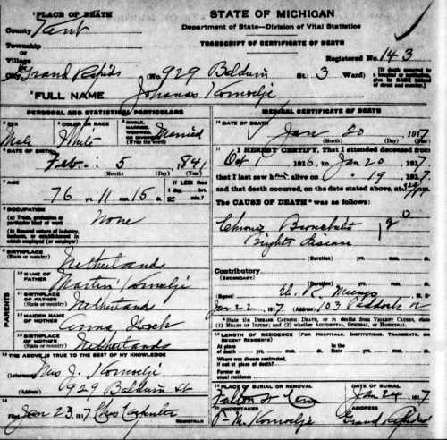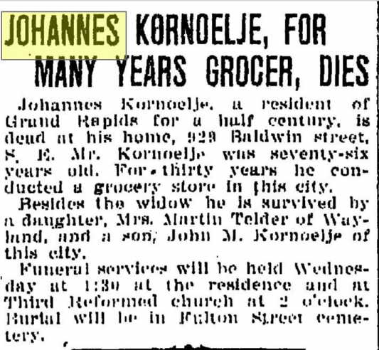 Grand Rapids Press, January 22, 1917: KORNOELJE – JOHANNES KORNOELJE, FOR MANY YEARS GROCER, DIES. Johannes Kornoelje, a resident of Grand Rapids for a half century, is dead at his home, 929 Baldwin St S.E.. Mr. Kornoelje was seventy-six years old. For thirty years he conducted a grocery store in this city.