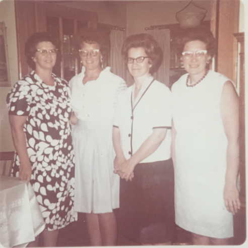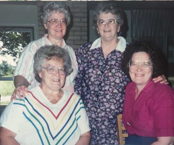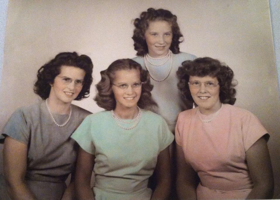 The first photo is from Lois’ photo album. Taken around 1947 give or take a year. The girls made matching dresses! Lois, Arlene, Julie and Marjorie in back