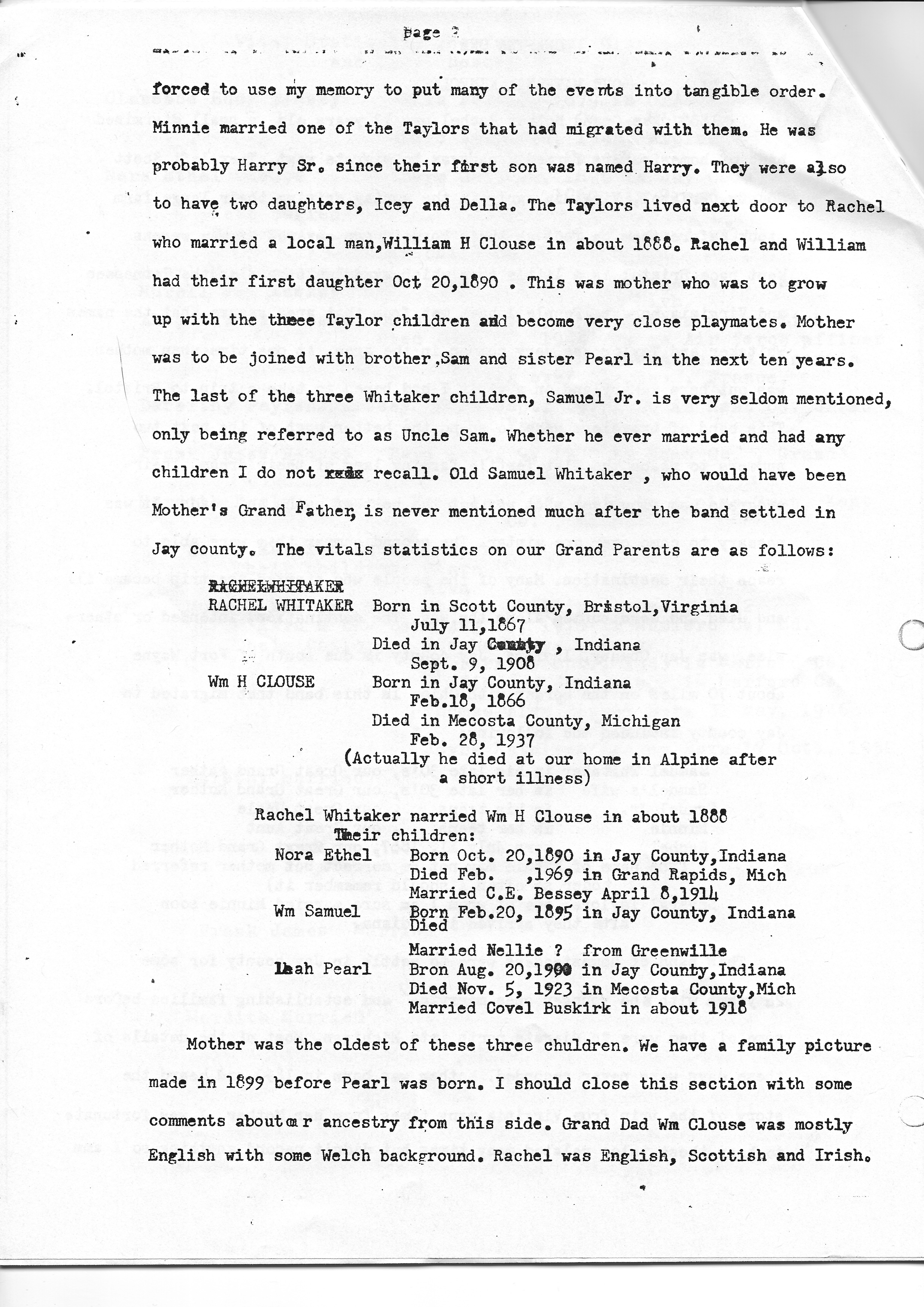 Rachel married William Henry Clouse on January 1, 1890 (not 1888). Ethel was born ten months later. Her brother William Samuel was born in 1895 and sister Pearl was born in 1900.