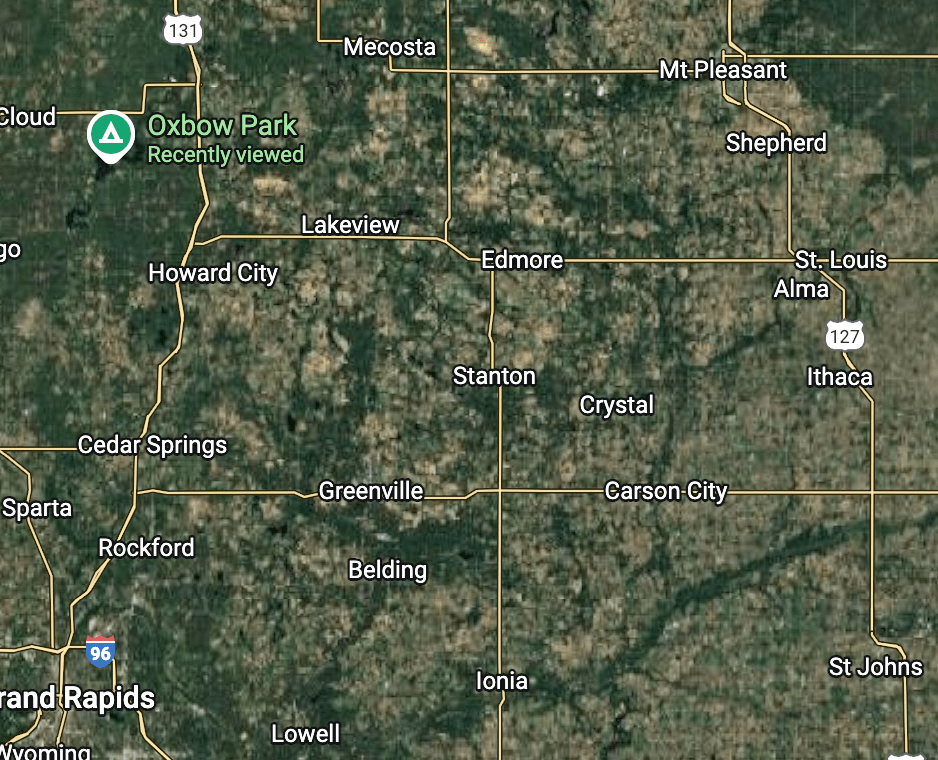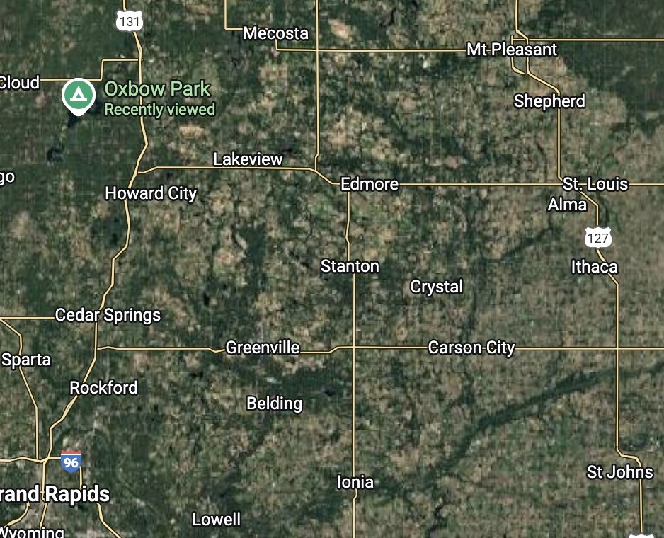 The map below shows all of the above named cities. Clarence and Ethel lived in Grand Rapids, bottom left. The distance from Grand Rapids to Mt. Pleasant is about 83 miles. Cadillac is north of Grand Rapids 95 miles. Traverse City is NW of Grand Rapids 142 miles.