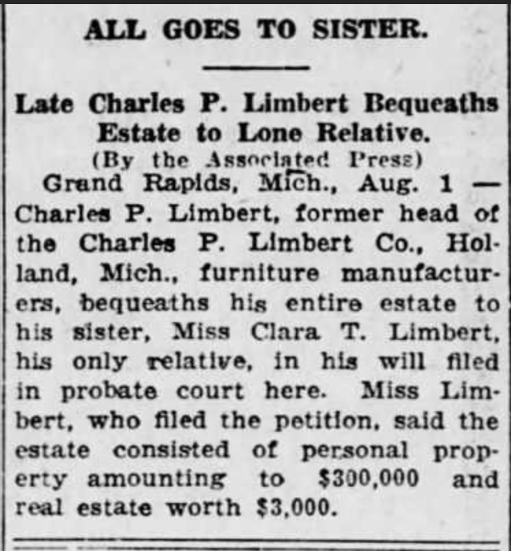 Murell mentions that Mr. Marsden “was offered a job in a private greenhouse ran by an old woman as a hobby which included living quarters……on Fisk Lake. The old woman with the greenhouse apparently didn’t know what to do with her money.” The woman Murell is referring to is Clara Limbert, sister of Charles Limbert. Charles Limbert was a pioneer furniture man in Grand Rapids. When he passed away in 1923, Limbert’s unmarried sister Clara was his sole heir. They lived together at the home on Robinson Road. His estate was worth $300k in 1923 which is equivalent to over Five Million Dollars today (2026). Mr. Marsden went to work for Clara Limbert in 1929. He worked for her through the 30s and into early 1940s. He was probably pretty lucky to have a secure job throughout the depression years. He passed away in May of 1945, just one month after Clarence died. Mrs. Marsden lived another 30+ years and passed away in 1978 at the age of 95.