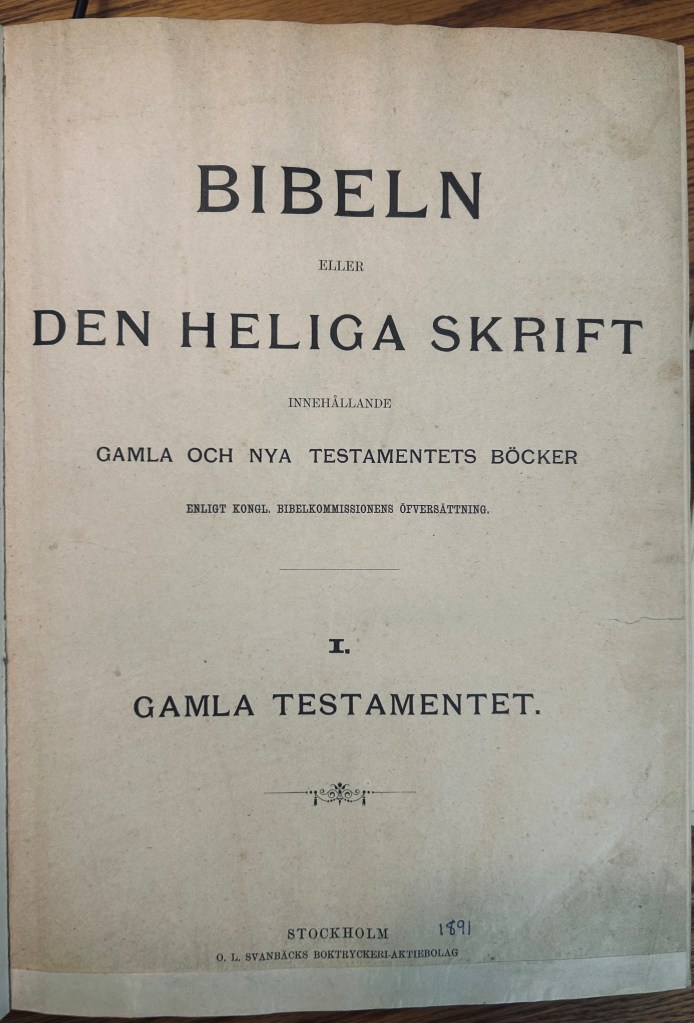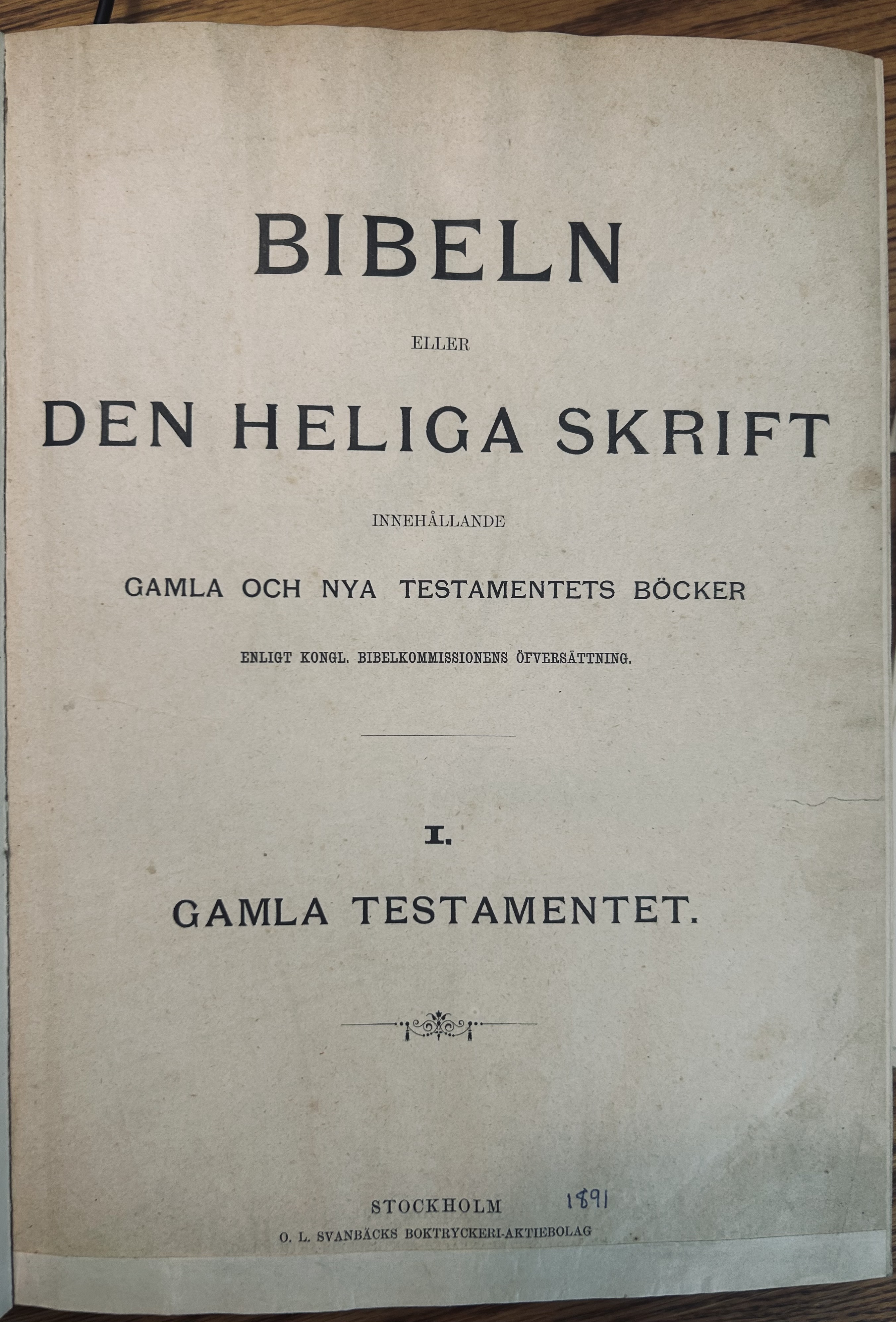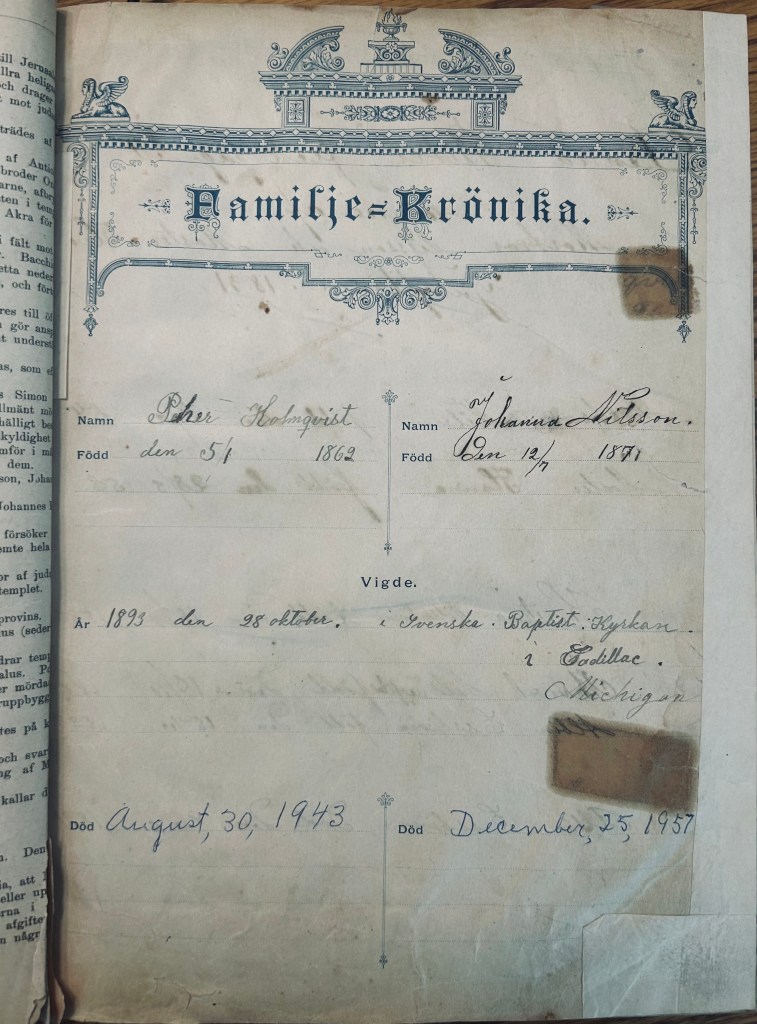 This Swedish Family Bible belonged to Peter and Hanna Holmquist. It was given to their daughter Ruth in 1940 by her mother, and upon Ruth’s death in 1992, this Bible went into the possession of her niece Arlene Holmquist Bour. Upon the death of Arlene in 2023, her daughter Sarah passed this bible on to her cousin, Sharon Ruth Nauta. It is currently in her possession.