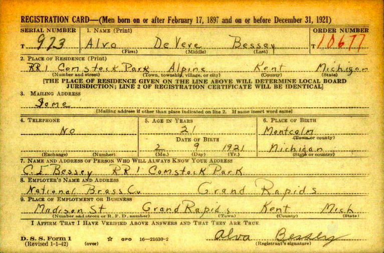 The country was at war a few years later. Alva registered for the draft just a week after his 21st birthday in February of 1942. It would be almost a year before he headed for training in the United States Army Air Corp.