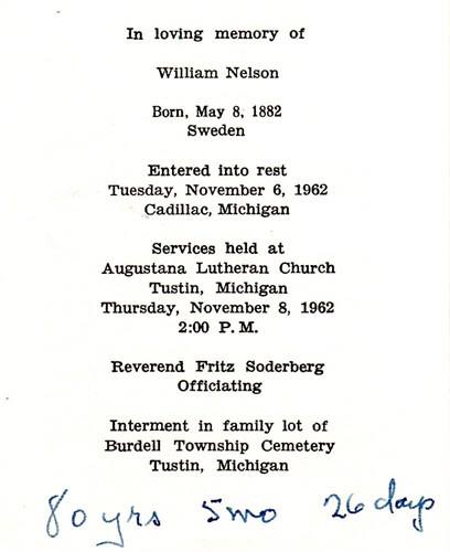 This is William Nelson, born May 8, 1882 in Sweden, died November 6, 1962, in Michigan. Will was the son of John and Ingrid Nelson, brother of Johanna (Nelson) Holmquist. He was married to Anna Carlson and they had six children.